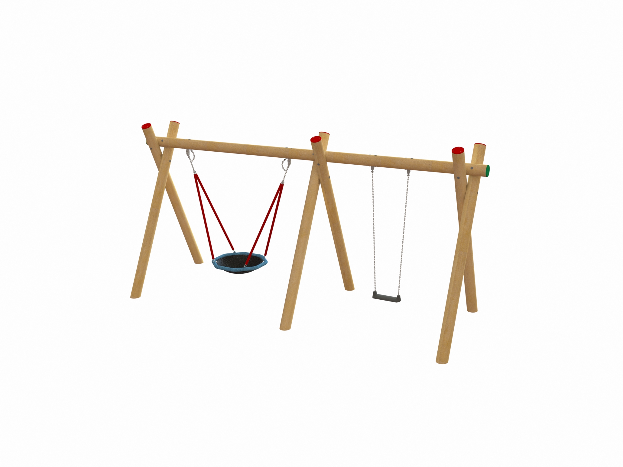 Robinia dubbele schommelcombinatie met een vogelnestschommel en een enkele schommel.