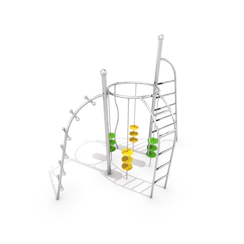 RVS klimrek met drie klimladders, een brandweerpaal en klimschijven.