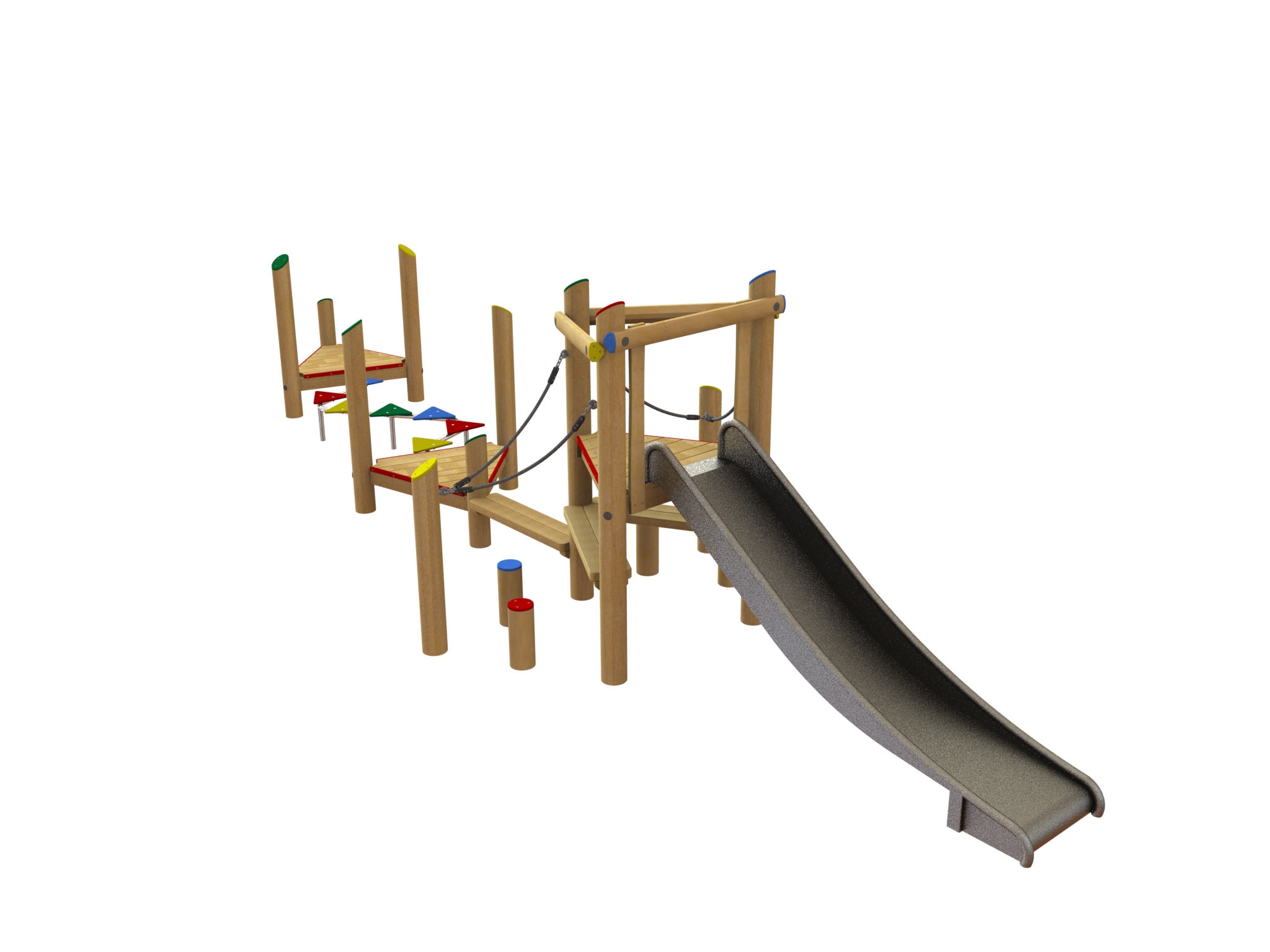 Deze variant van de Mini Delta Parcours bestaat uit verschillende onderdelen en biedt een uitdagende speelcombinatie voor jongere schoolkinderen. Het speeltoestel beschikt onder andere over een slingerloop, welke het evenwicht en de balans van kinderen op de proef stelt. Ook bestaat dit toestel uit een glibberklim, waar kinderen door gebruik te maken van platformen en touwen gecoördineerd naar boven kunnen klimmen. Naast de glijbaan beschikt deze variant van de Mini Delta Parcours over gekleurde paalkapjes op de palen, wat kinderen nog meer speelwaarde en speelbeleving biedt!