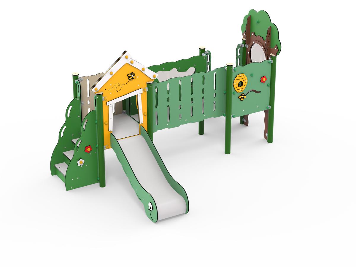 Kunststof mini-speelcombinatie met twee trapjes, een glijbaan en verschillende speelpanelen.