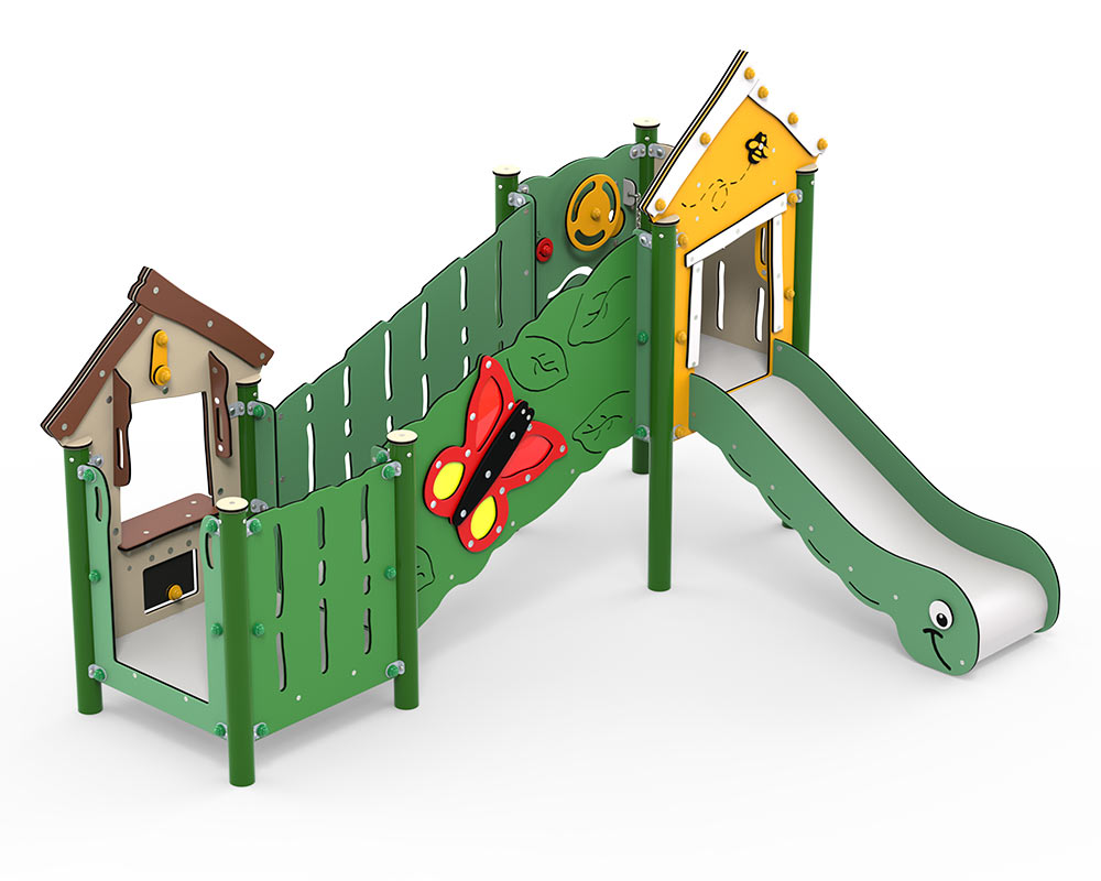 Kunststof mini-speelcombinatie met een schuine loopbrug, een glijbaan en een speelkeukentje.