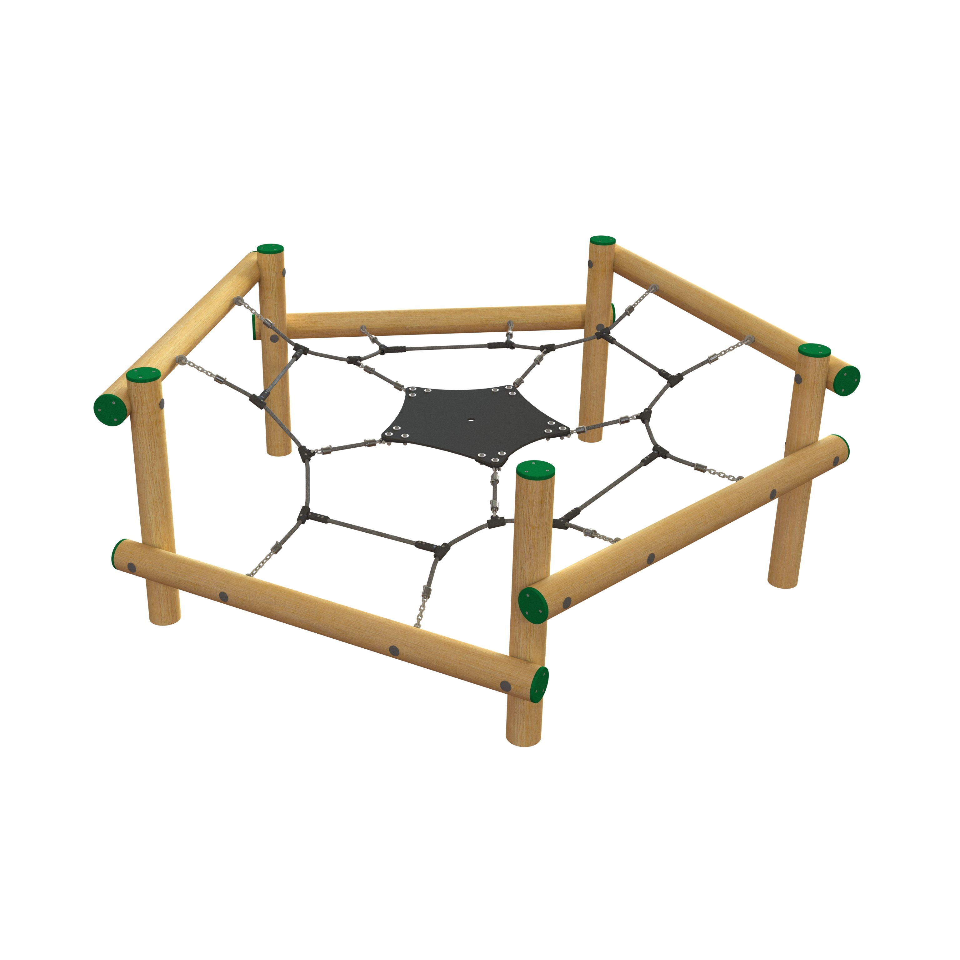 Het Pentagon web bestaat uit een een klimnet (gelijke liggers) en vijf staanders, gemaakt van spintvrij Robinia hout. Het toestel is een vrij compact toestel wat het makkelijk toepasbaar maakt op de kleinere speelruimtes. De PE paalkapjes zorgen ervoor dat inregenen op de kop niet mogelijk is waardoor het hout, en dus het speeltoestel, langer mee gaat. Het toestel heeft een valhoogte van 100cm en dient dus op een valdempende ondergrond geplaatst te worden. Het toestel is 1 meter hoog en heeft een oppervlak van 33 vierkante meter nodig aan vrije ruimte.