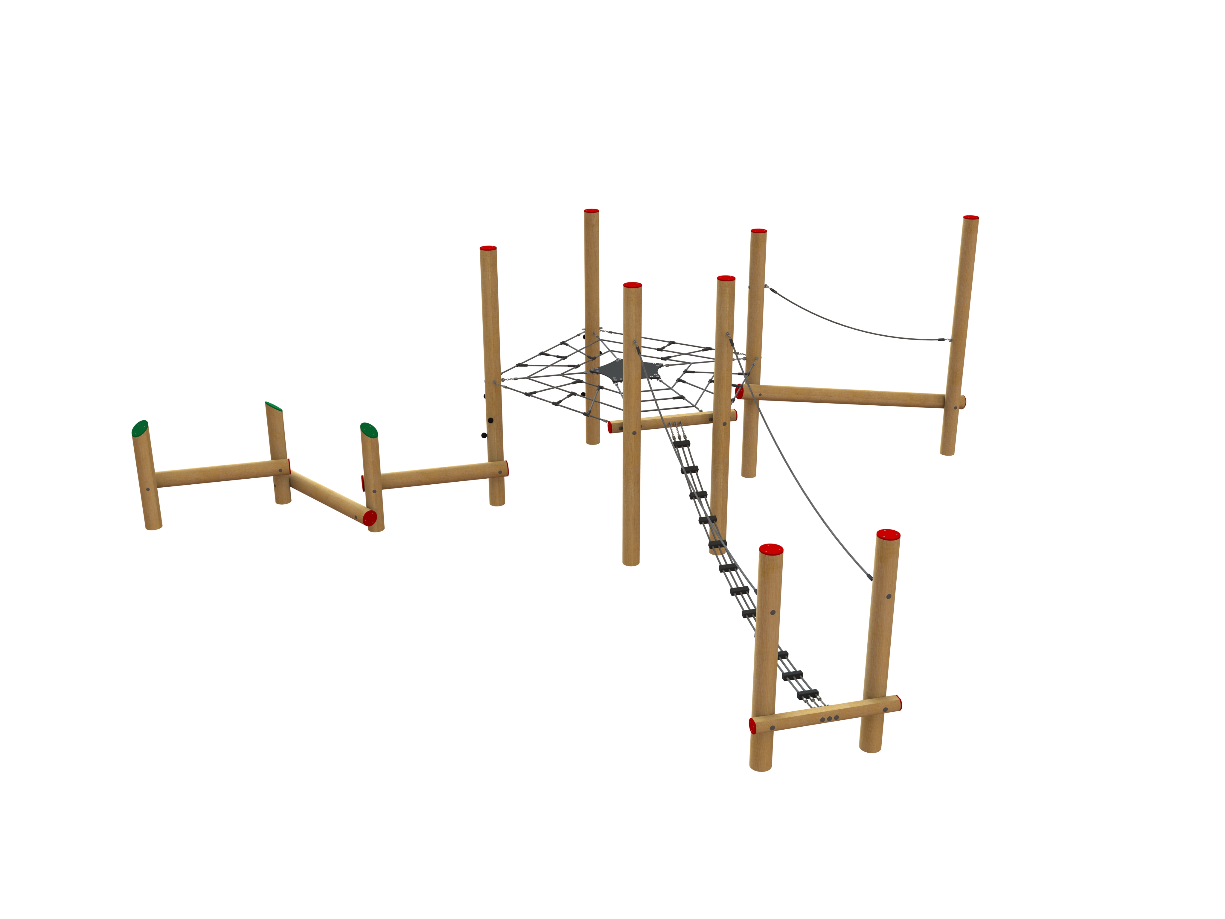 Klimtoestel met verschillende evenwichtstoestellen en spinnenweb, lage variant.