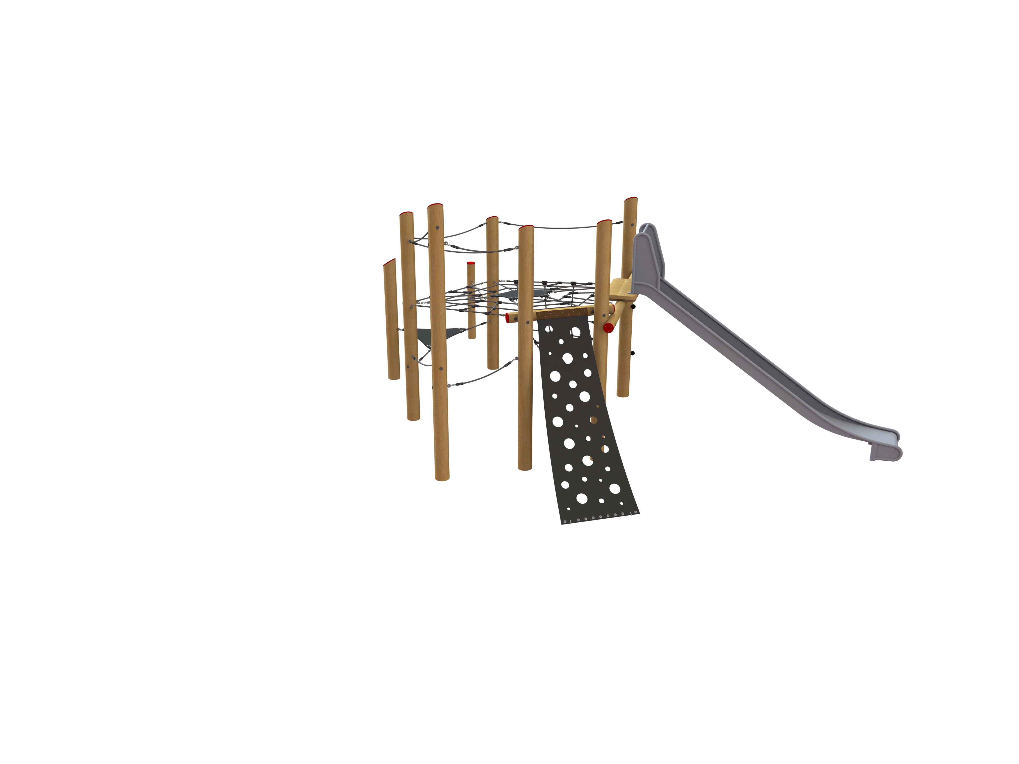 Klimtoestel met klimwand, spinnenweb en glijbaan.