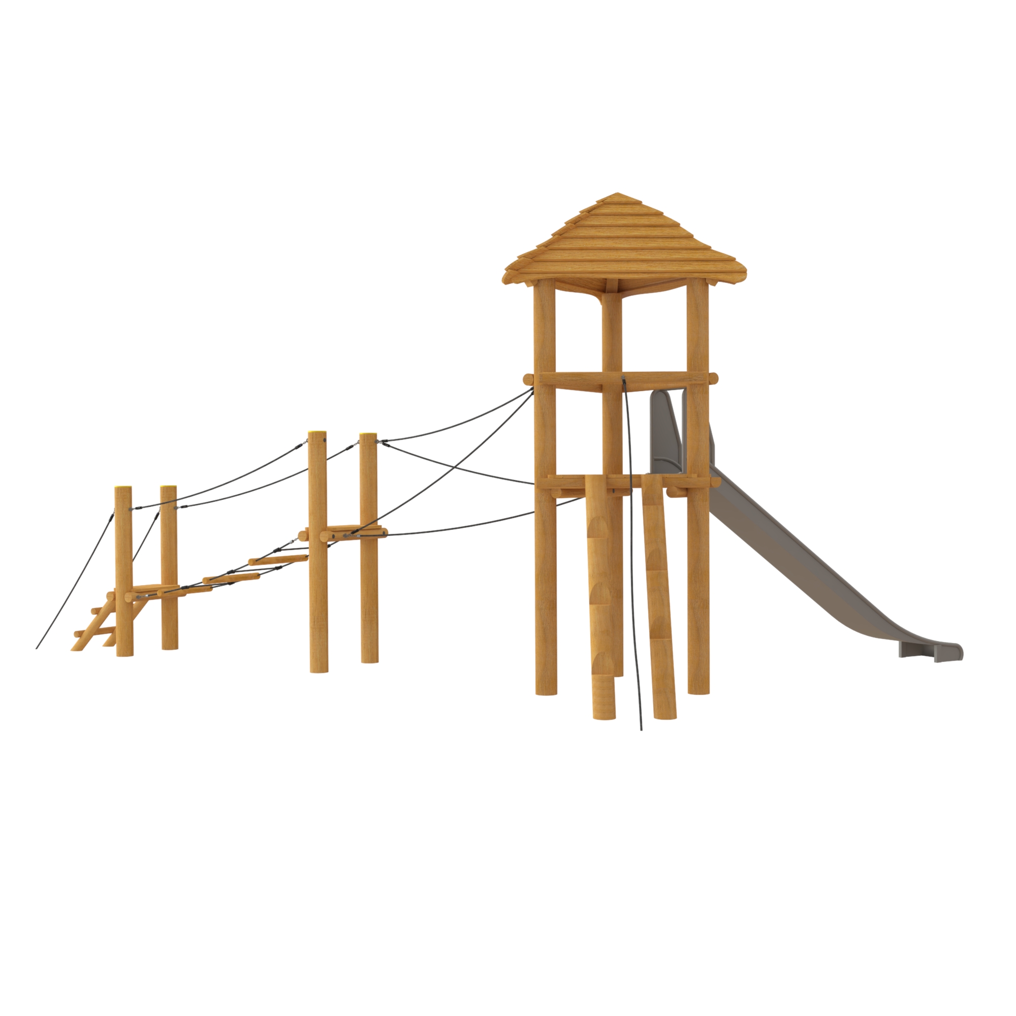 Robinia toren met een touwbrug en een glijbaan.