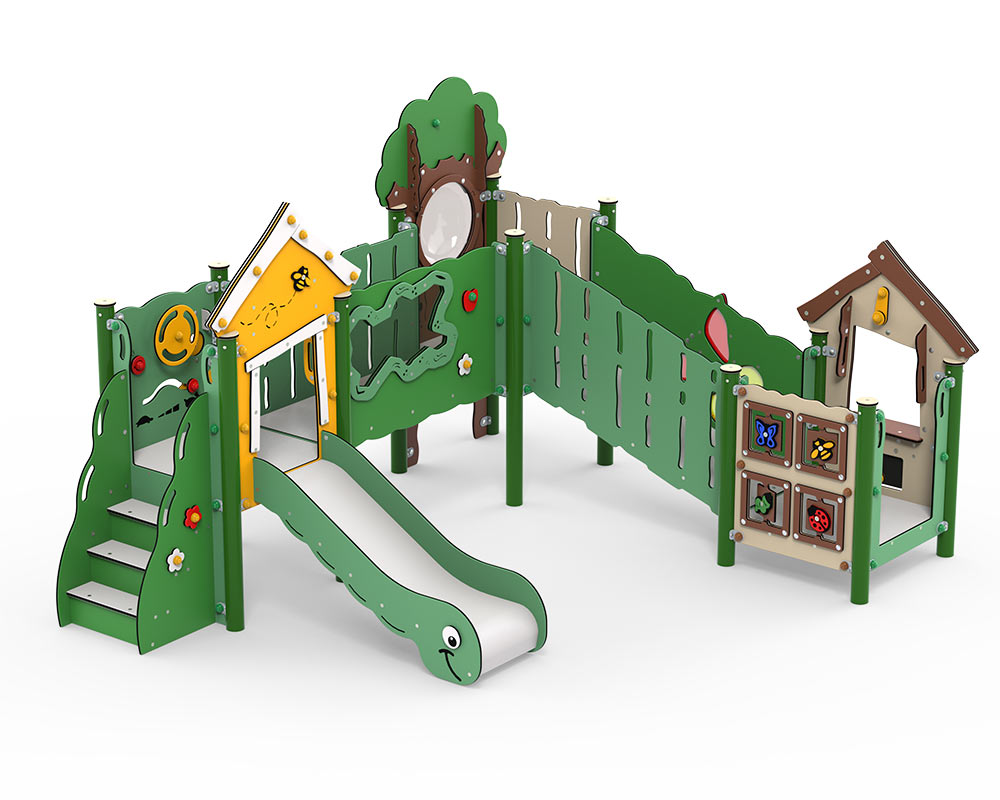 De speelcombinatie zit vol met draaiende en bewegende functies. Naast de bewegende bloemen, vlinders en bijen is er een speelpaneel die kinderen aanmoedigt om te praten en als geheugenspel dient. Het paneel heeft vier dieren met verschillende kleuren. Dit leidt al snel tot uitwisselingen over de dieren en de kleuren, en raden waar de wezens zich hebben verborgen. Tegelijkertijd oefent het spel de fijne motoriek en taalvaardigheid van de kinderen.