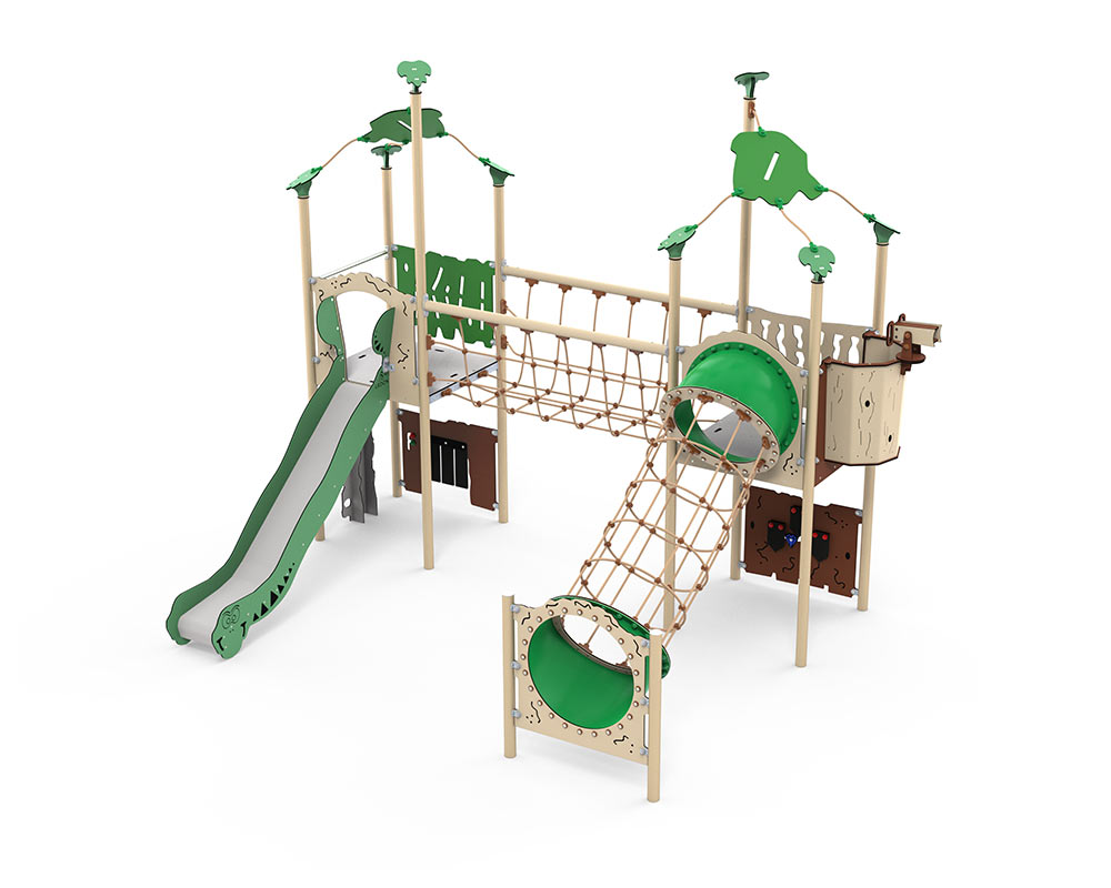 Kunststof speelcombinatie met een klimparcours, een glijbaan en verschillende speelpanelen.