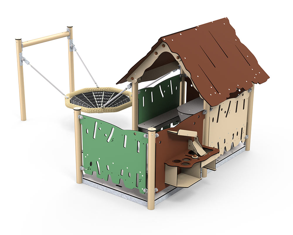 Kunststof speelhuisje met veranda en nestschommel. Aan de veranda zit een zand- en waterspel.