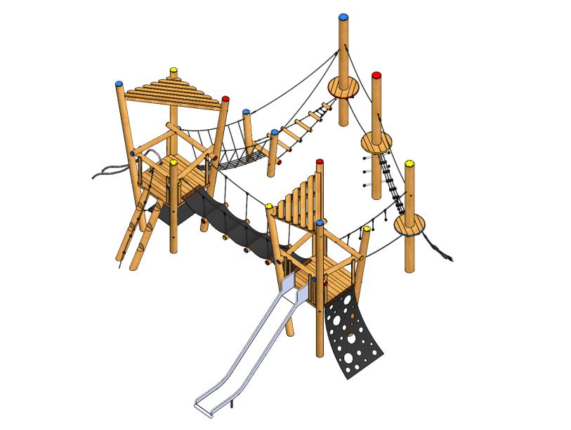 De torencombinatie met klimparcours en glijbaan wordt, net als de andere speeltoestellen in ons natuurlijk spelen assortiment, gemaakt van spintvrij Robinia hout. De hoogste toren is 4.95 meter meter hoog. De palen van het speeltoestel zijn gemiddeld 17 centimeter dik.