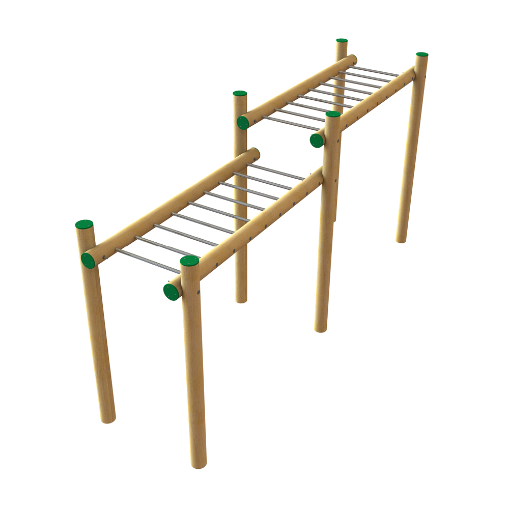De monkey bars zijn een uitdagend trimtoestel. Aan je armen naar de overkant klimmen via de RVS stangen. Het trimbaan toestel is gemaakt met een Robinia houten frame. Aan de bovenbalken hangen RVS stangen om aan te slingeren. De monkey bar kan verwerkt worden in een trimparcours of trimbaan, maar kan ook los toegepast worden als speel- of sporttoestel.