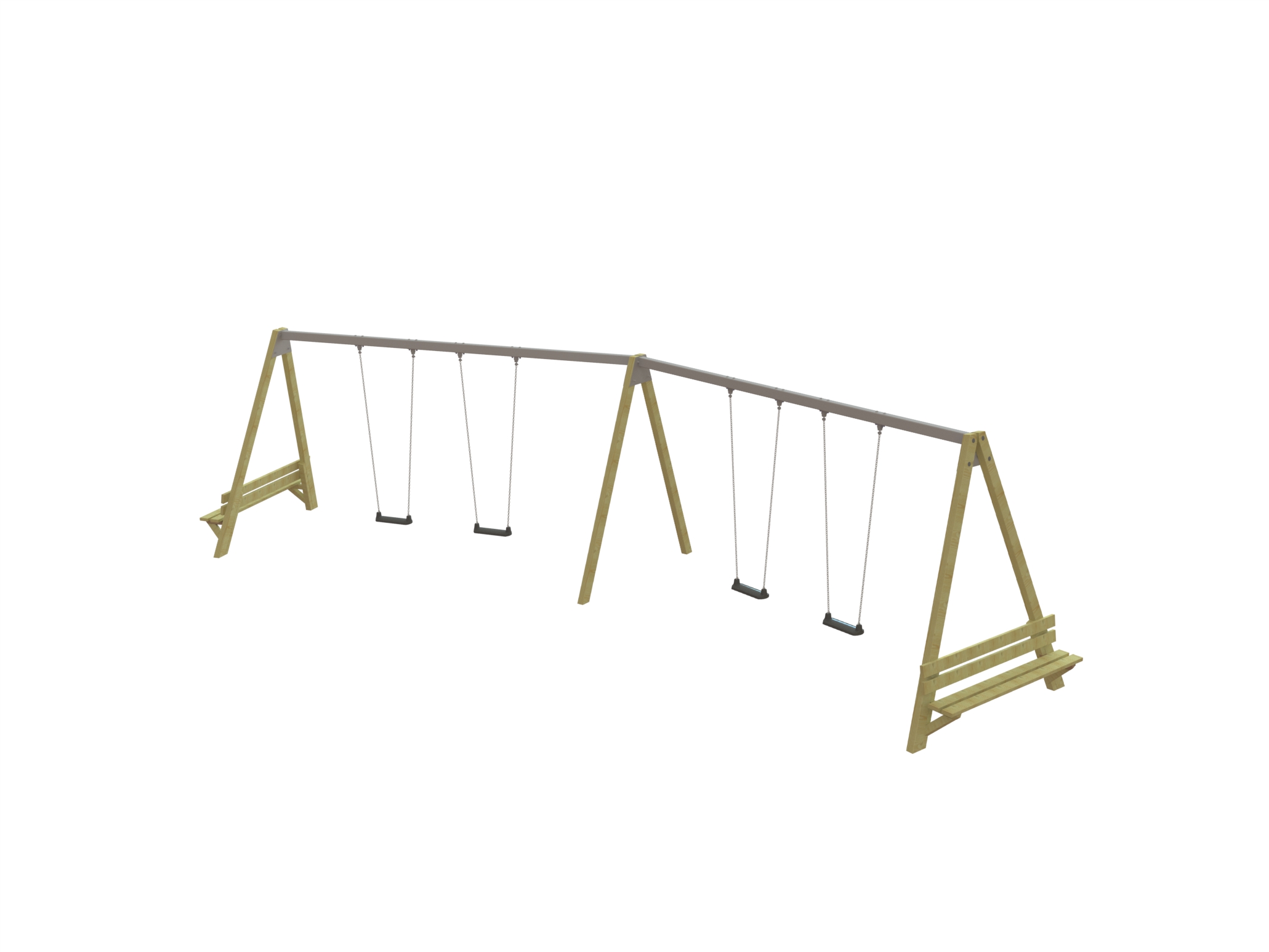 Hardhouten gekoppelde schommel met vier schommelzitjes en bankjes aan de zijkant, Schuin.